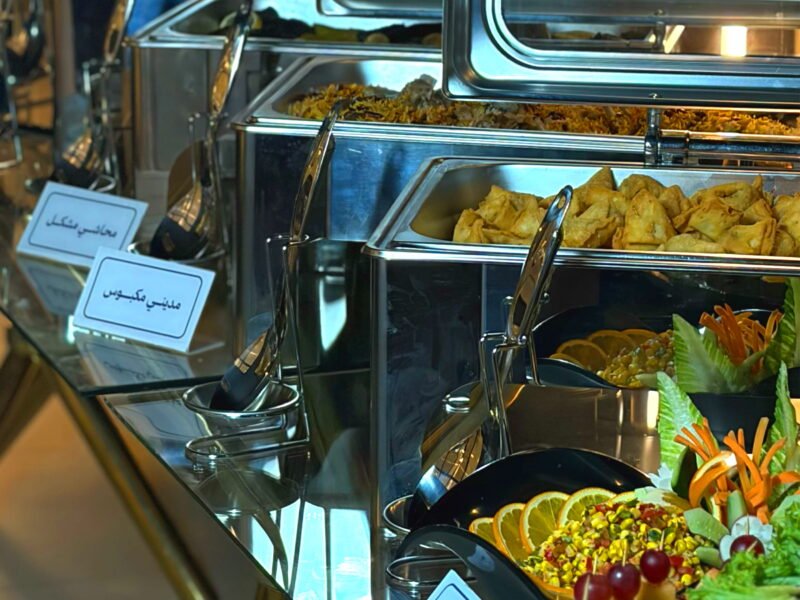الأصناف الساخنة: كبده اسكنراني – هوت دوج مكسيكان – استربس – بيف بيكون سوتيه – بطاطس ودج مع الاعشاب – بيض مسلوق – بيض مخفوق مع الباباروني – فول جلابة – فول حب مع ( فلفل الوان – طماطم – بصل – بهارات – زيت زيتون – طحينه )
